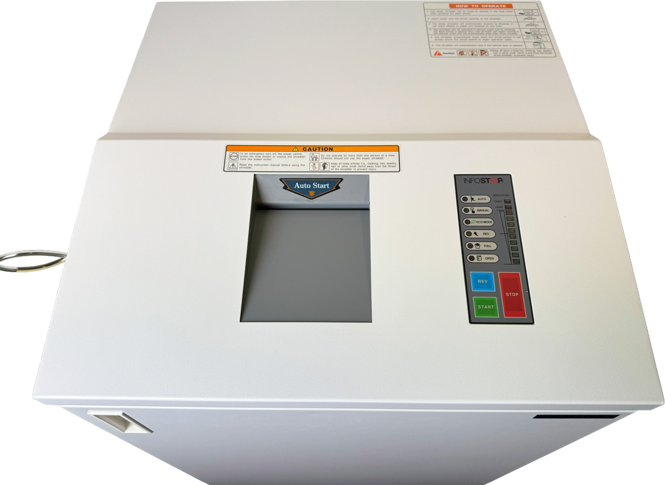 The INFOSTOP IS8714OM is a High Security Optical Media shredder that meets “Top Secret” requirements with a 850 disc per hour processing capacity.